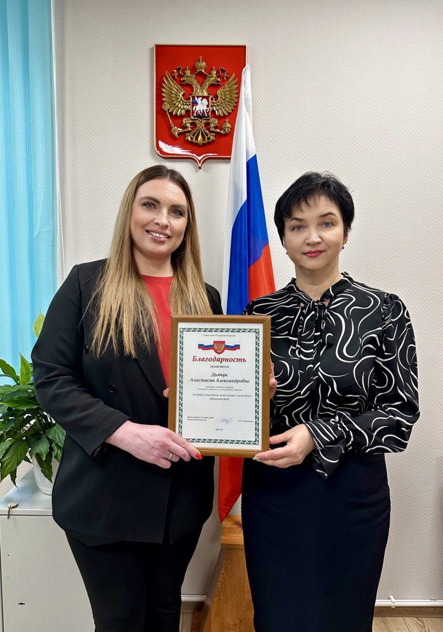 | Председатель Сегежского городского суда Республики Карелия Пушаева Е.П. вручила Благодарность Совета судей Республики Карелия секретарю судебного заседания Дьячук Анастасии Александровне | версия для печати |